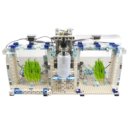 В собранном виде набор представляет собой настольную модель теплицы с двумя внутренними отсеками, на внешней стороне которых монтируется микрокомпьютер, контролирующий параметры модели и управляющий исполнительными механизмами, а также датчики и оборудование, согласующее разные узлы системы. Каждый отсек оборудован датчиками света, температуры и влажности почвы.