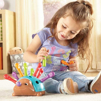 Развитие мелкой моторики в процессе размещения и вытаскивания трубочек-колючек из спины Спайка. Трубочки представлены в четырех цветах: красный, оранжевый, зеленый и фиолетовый