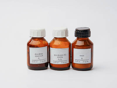 Набор химических реaктивов № 7 ОС Огнеопасные вещества Состав набора (кг): Сера - 0,05. Фосфора (V) оксид - 0,05. Фосфор красный - 0,05.