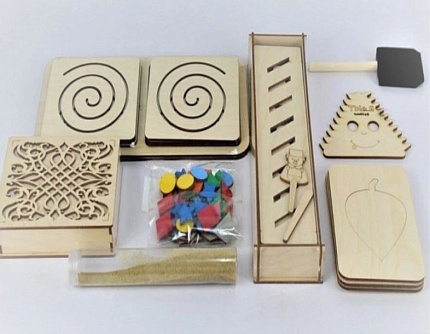 - Набор развивающих линеек - линейки в комплекте, имеется деревянный карандаш. С его помощью на песке появятся настоящие узоры, разовьется моторике и рука подготовится к письму. Материал - дерево.