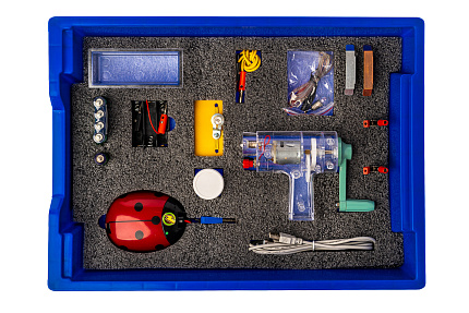 Модуль НАУРАША для изучения понятия “Электричество” включает в себя: датчик измерения напряжения от -5 В до 5 В, соединительный кабель, батарейный блок, батарейку АА (5 шт.), лампу на подставке, электрод цинковый, электрод медный, кювету, банку с пищевой поваренной солью, динамомашину, зажим «крокодил» (2 шт.), провод соединительный (2 шт.)