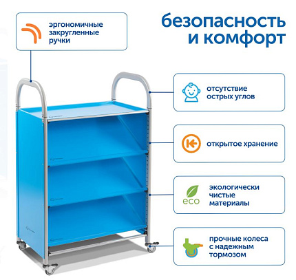 Наклонные полки позволяют продемонстрировать пособия, которые использует ваше учреждение. Стеллаж визуально разгружает пространство и экономит свободное место.