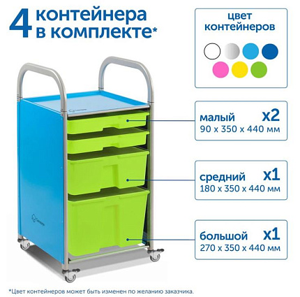 Компактная металлическая тележка с глубокими контейнерами оборудована направляющими, препятствующими выпадению контейнеров. Направляющие можно установить на любой высоте.