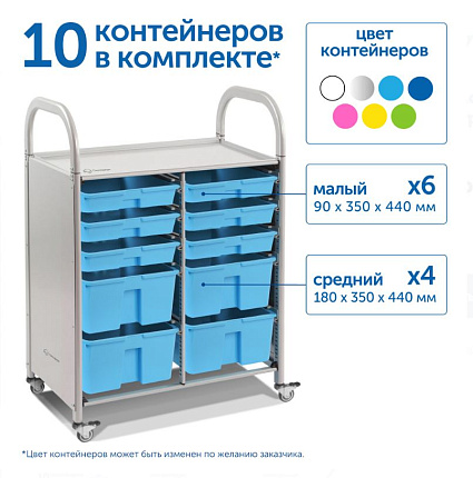 Компактная металлическая тележка с глубокими контейнерами оборудована направляющими, препятствующими выпадению контейнеров. Направляющие можно установить на любой высоте.