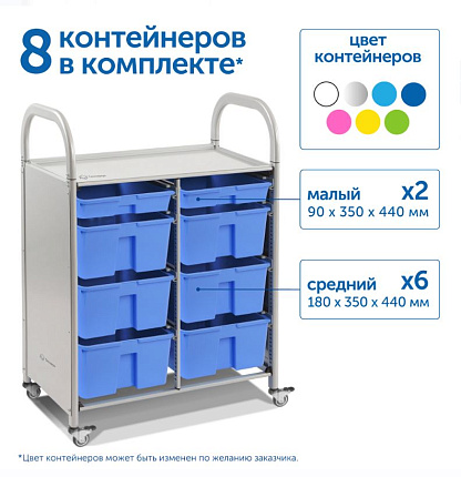 Компактная металлическая тележка с глубокими контейнерами оборудована направляющими, препятствующими выпадению контейнеров. Направляющие можно установить на любой высоте.