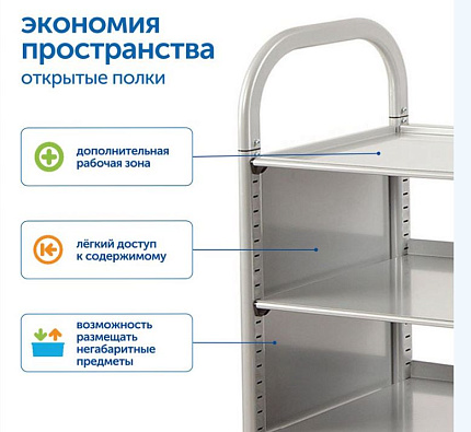 Компактная металлическая тележка подстраивается под любую площадь помещения. Полки изготовлены из стали с порошковым покрытием. Материал устойчив к царапинам.